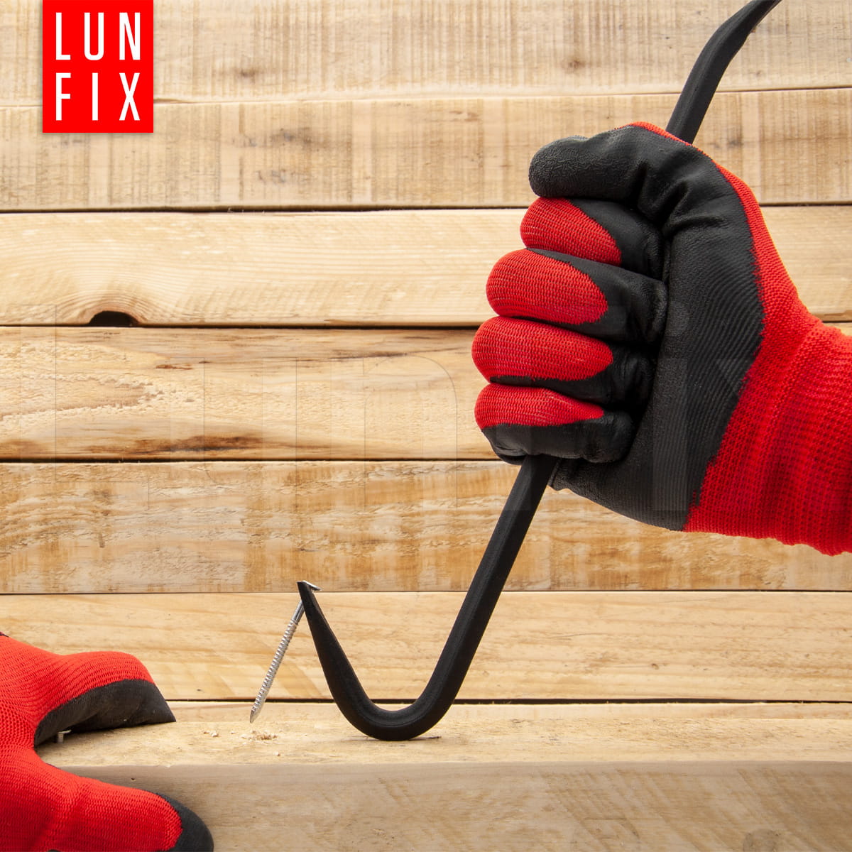 Łom poradzi sobie z wieloma rodzajami gwoździ do 4mm grubości, a ich długość nie ma znaczenia! Wystarczy podłożyć pod łom kawałek drewna bądź deski, aby wydłużyć część roboczą.