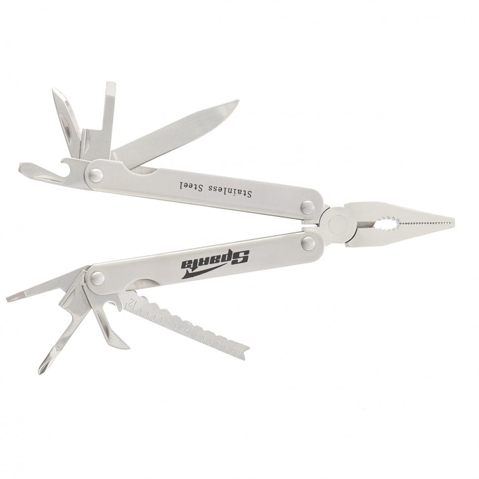 - Multi-tool zapewnia fukcje: szczypce płaskie, szczypce długie, obcążki, chwytak przedmiotów okrągłych, nóż do czyszczenia ryb, linijka, śrubokręt krzyżowy, nóż, otwieracz do puszek, otwieracz do butelek, śrubokręty do śrub z łbem rowkowanym – duży i mały, mały i duży noże.