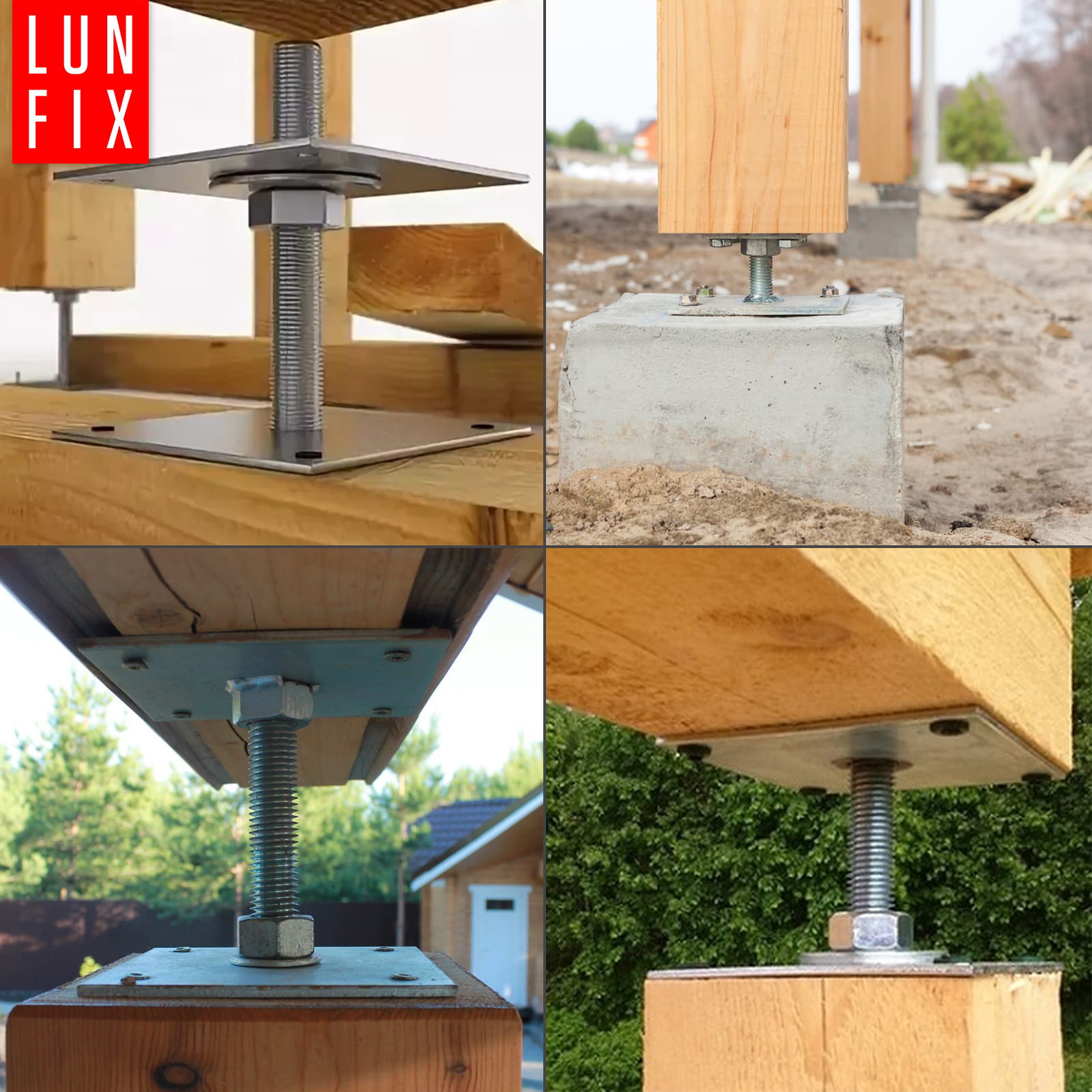 Podstawa słupa regulowana przykręcana służy do mocowania drewnianych słupów nośnych w twardym podłożu, np. betonie, drewnie, stali. Podstawa umożliwia montaż do powierzchni za pomocą kotw i śrub.