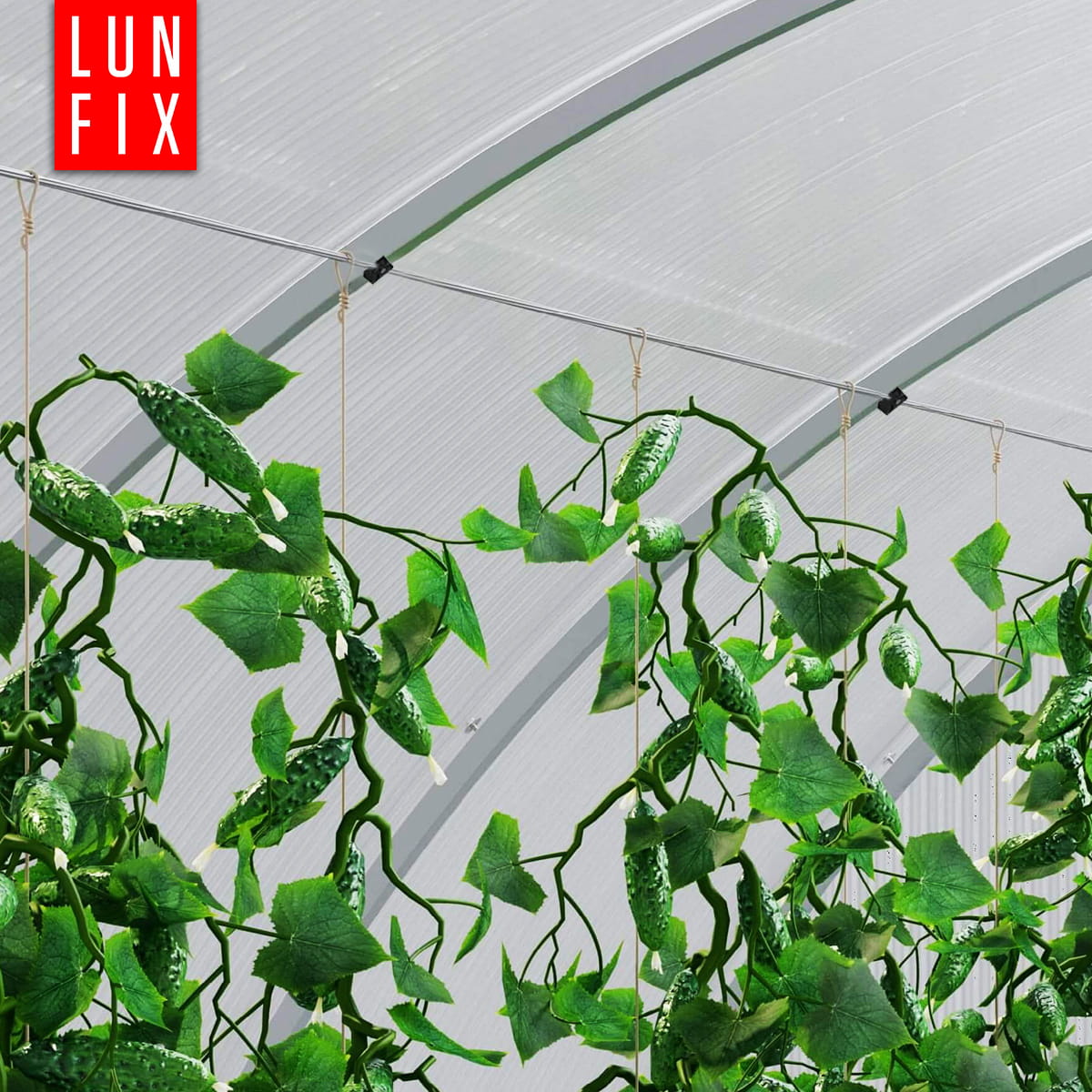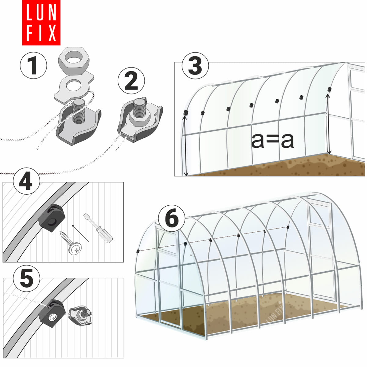 Zestaw jest kompatybilny z każdą szklarnią LUN FIX do 6m długości (z odległością 0,67cm pomiędzy przęsłami/łukami)
