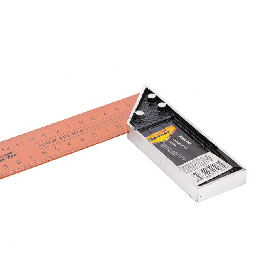 - Kątownik metalowy z malowaną powierzchnią i dwustronnymi oznaczeniami na płótnie.
