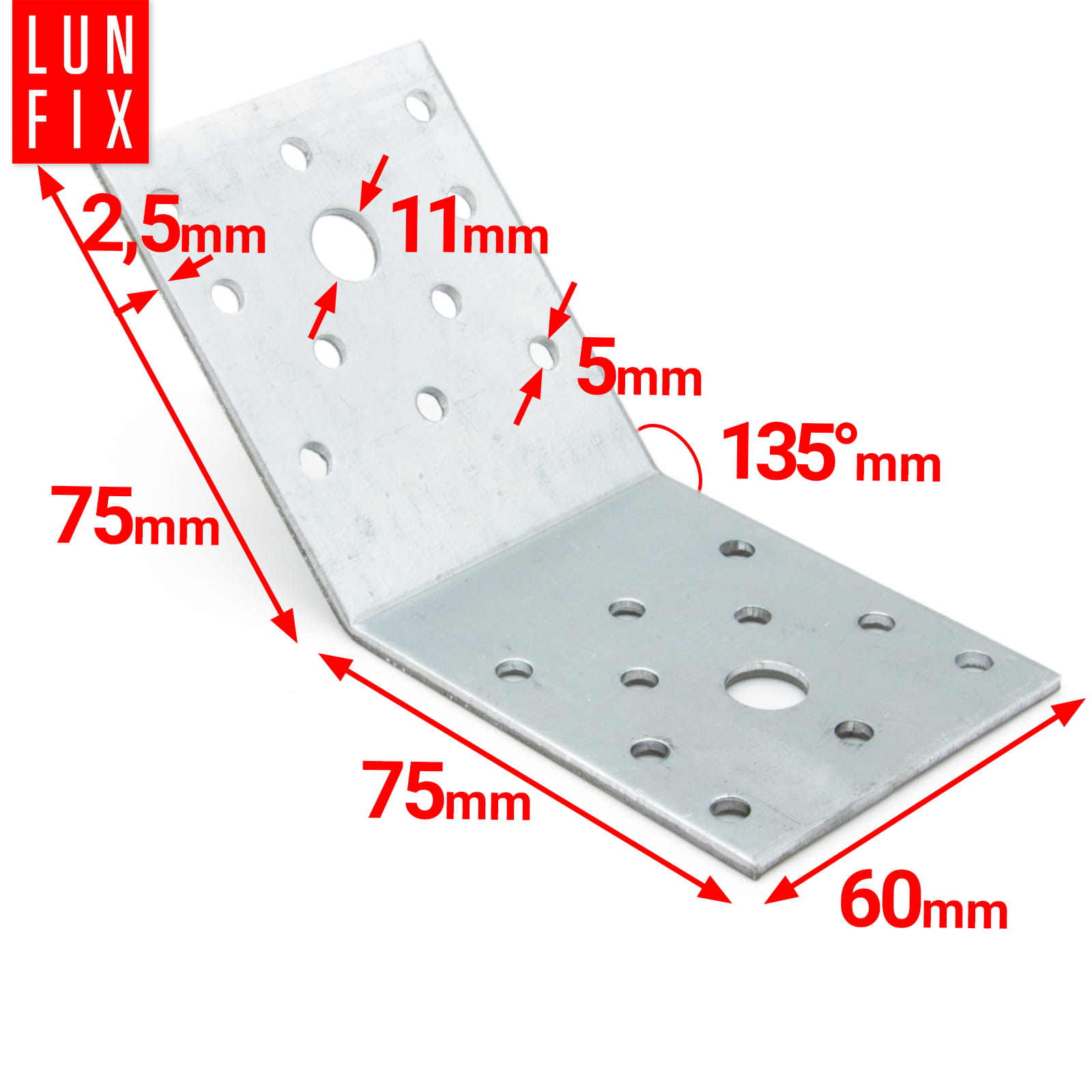 Kątowniki równoramienne z kątem rozwartym 135 stopni to wąska grupa rodziny łączników ciesielskich. Przeznaczone do montażu zastrzałów, mieczy lub przekątnych wzmocnień ramowych i dostępne w różnych rozmiarach.