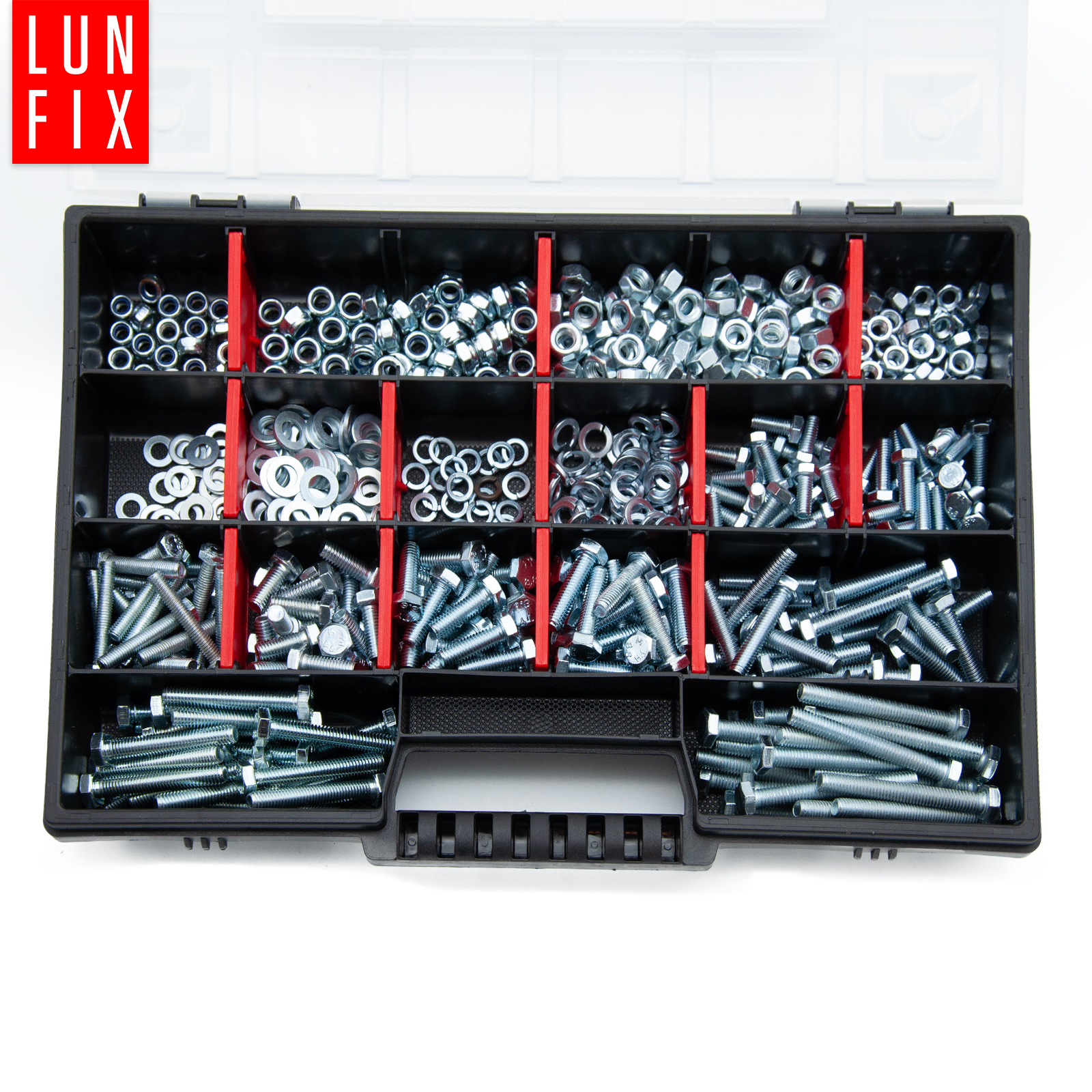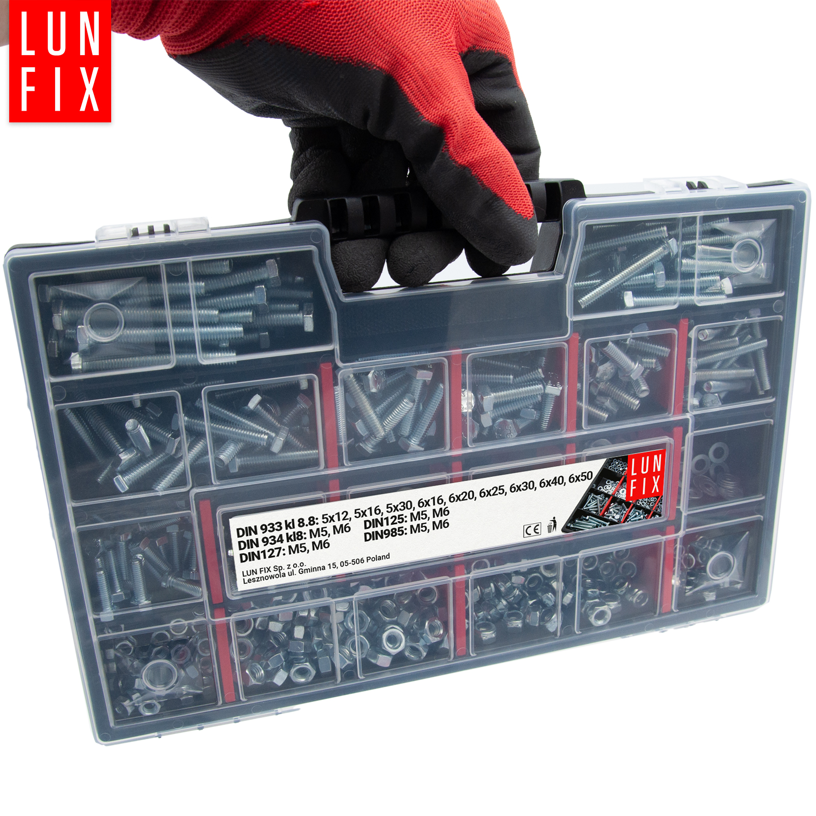 Ten zestaw zawiera najpopularniejsze rodzaje i wielkości śrub, nakrętek oraz podkładek, dzięki czemu zawsze będziesz mieć pod ręką ten element, którego akurat potrzebujesz. To nie wszystko. Złącza zapakowaliśmy w poręczną, przenośną i wytrzymałą skrzynkę, której możesz użyć zawsze, do innych narzędzi i akcesoriów modyfikując dowolnie jej przegrody.